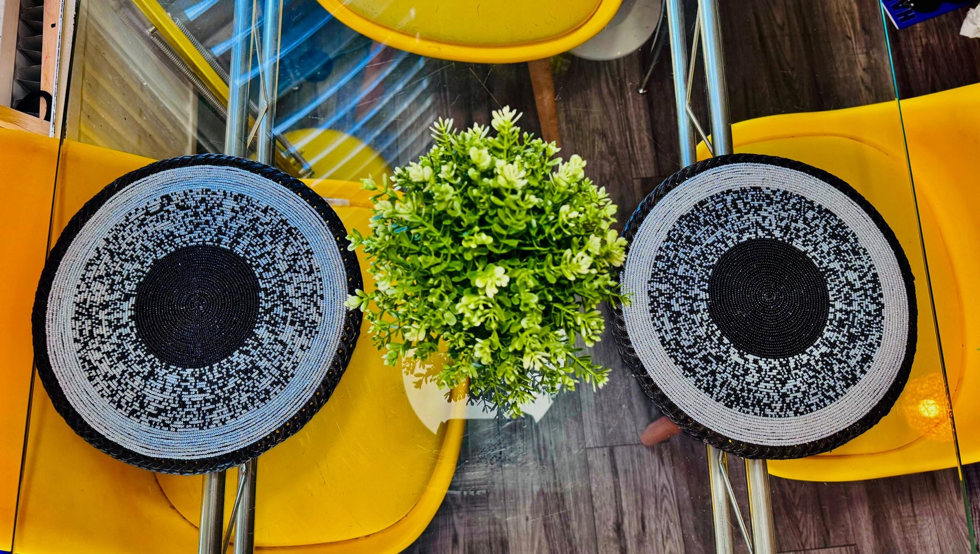 Elevate your dining experience with our Beaded White and Black Placemat Set, Each placemat is meticulously handcrafted using high-quality glass beads intricately arranged in a striking black and white pattern.